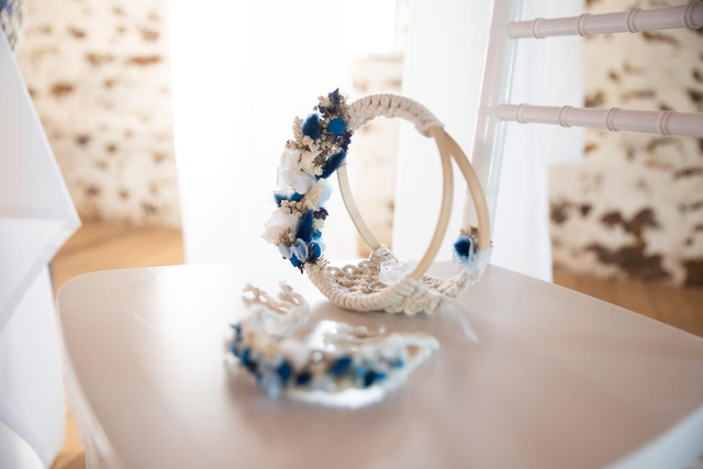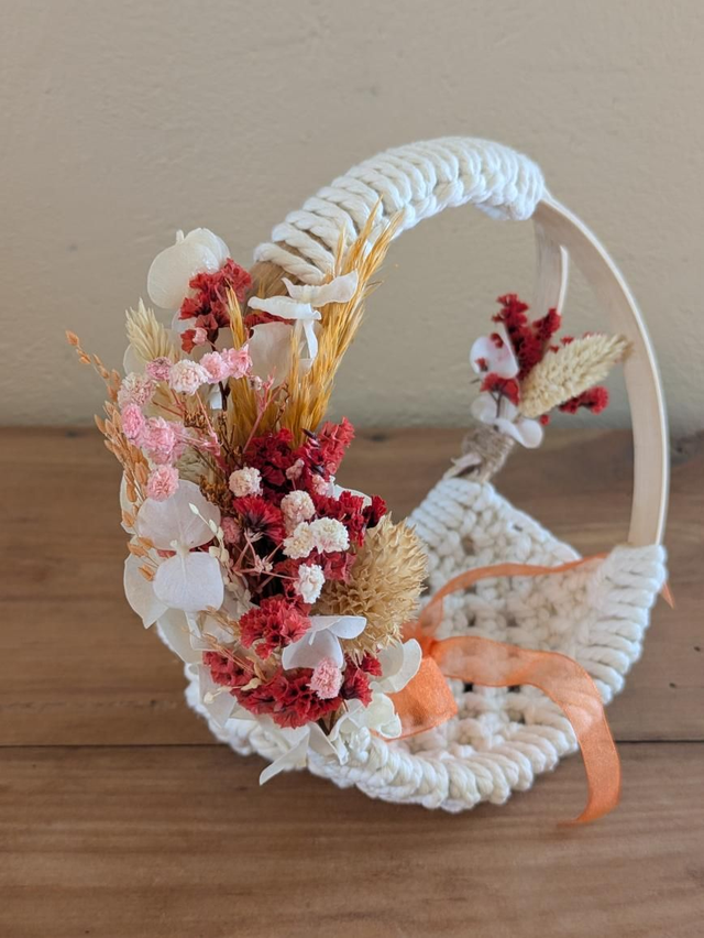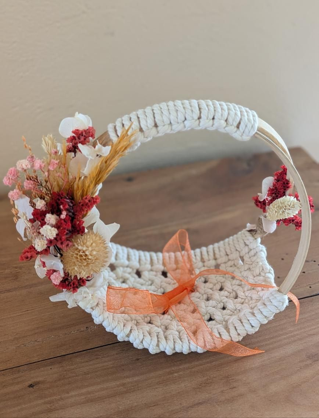 Dans un style très bohème, il est fait de 2 anneaux en bois et de tressage en corde écru avec quelques fleurs séchées.